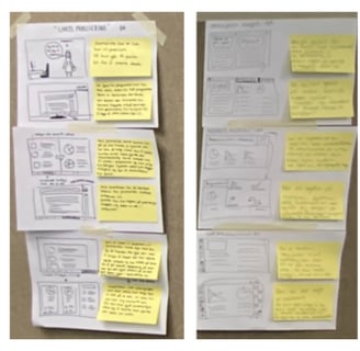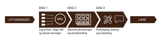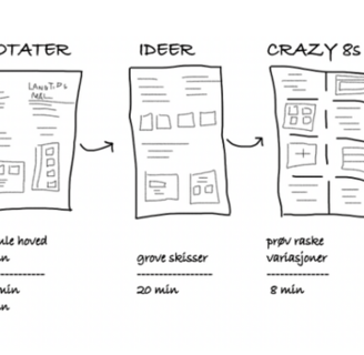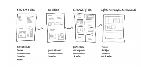 The next steps included individual Crazy 8s, and the final task of the day was Individual Solution Sketches. Drawings on three A4 sheets with the best ideas were taped together to create anonymized, self-explanatory solution proposals.