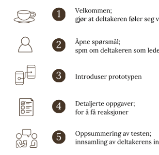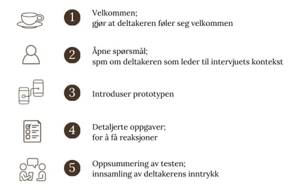 Prototyping was conducted in three intervals, with summaries and breaks after each round. The five-step interview and test guide is shown to the right.