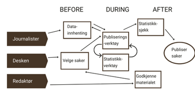 We continued by mapping the workflow. The map included stakeholders and the process at Bergensavisen for sending out a news story. It was categorized as “before,” “during,” and “after.” We then identified the problem area, with Decider having the final vote.